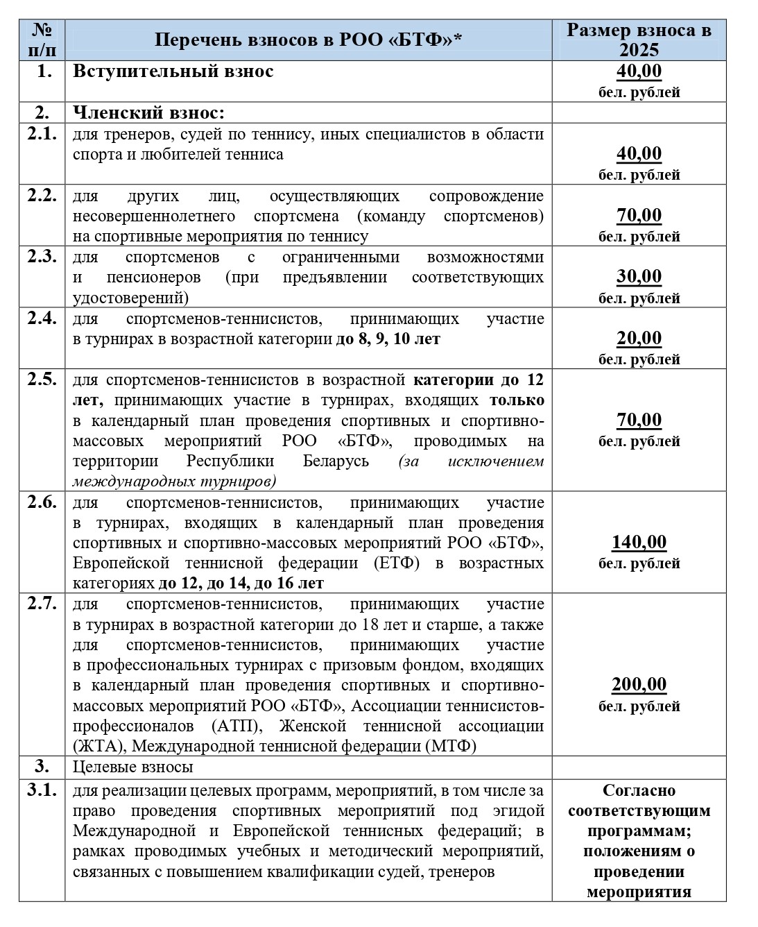 Уплата ежегодных членских взносов осуществляется в соответствии с пунктом 3.6. Устава РОО «БТФ».